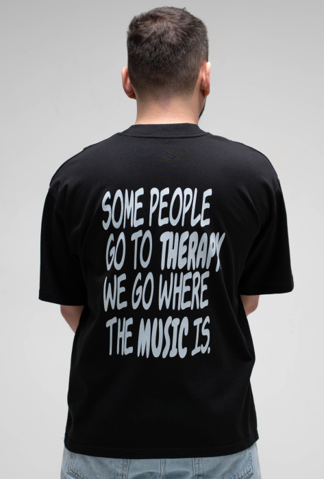 Tricou negru statement cu mesaj bold potrivit pentru iubitorii de muzică. Croială lejeră, material confortabil și print contrastant care atrage privirile — perfect pentru club, festival sau outfituri streetwear.